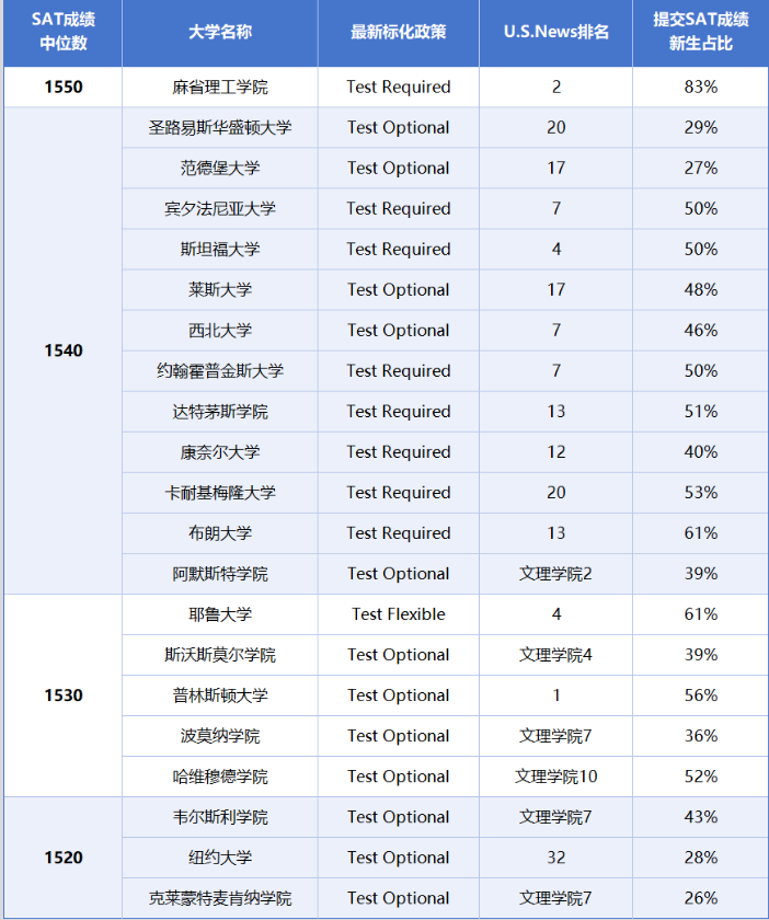 MIT 以 1550 分 SAT 中位数登顶榜首,且高达 83% 的新生均提交了 SAT *。