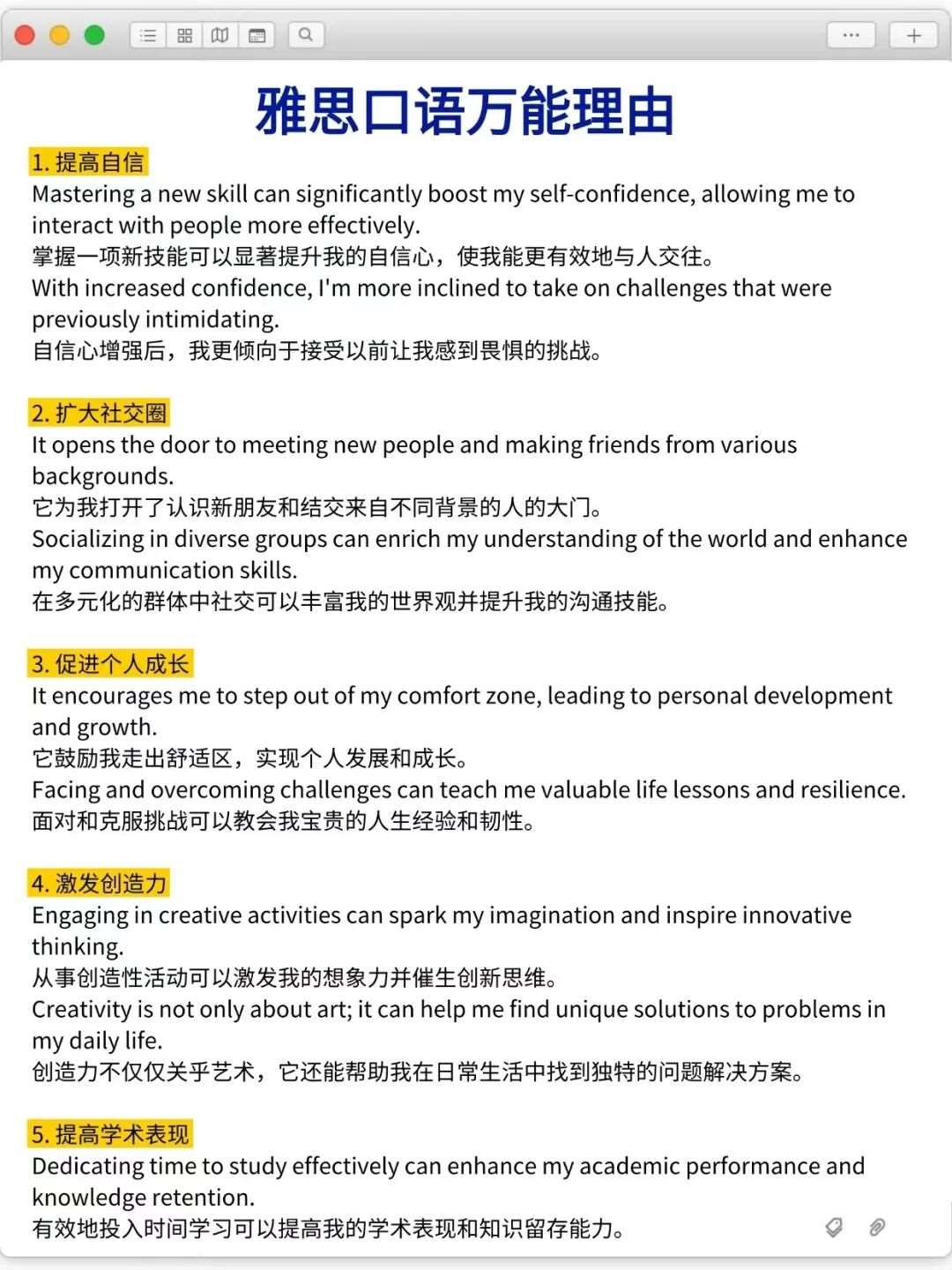 今天整理了30组雅思口语理由,全是考场高频好用款,中英文对照,背完直接用!(文末领取资料)
