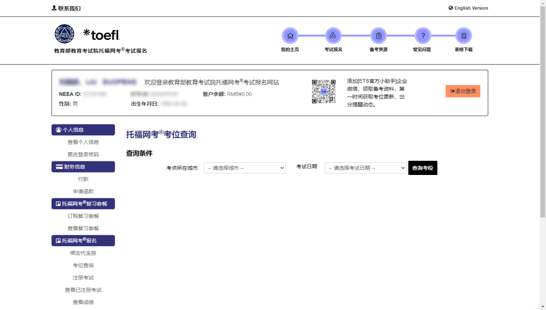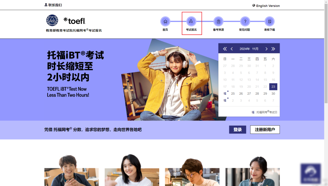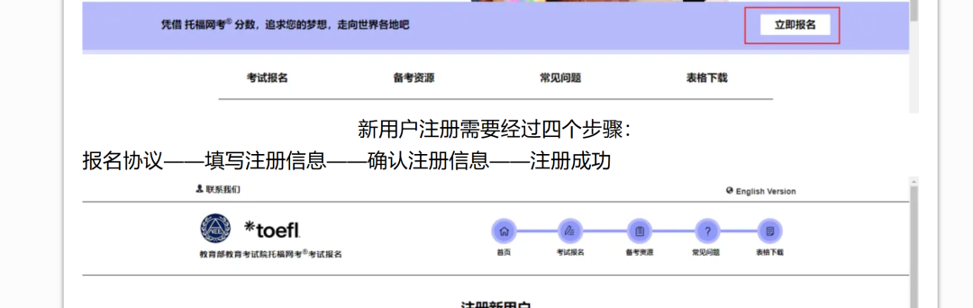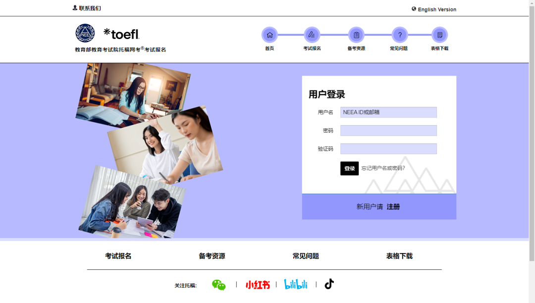 新用户需在官网 https://toefl.neea.cn 点击“注册”