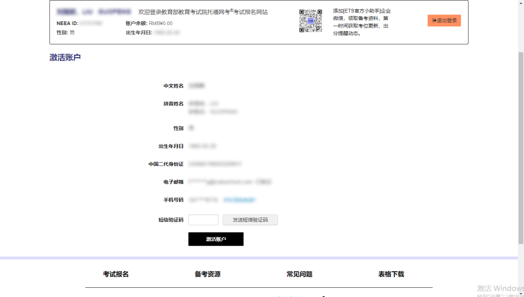 其次,还需要验证手机号,会给你注册时留下的手机号发送验证码,输入验证码,点击“激活账户”。