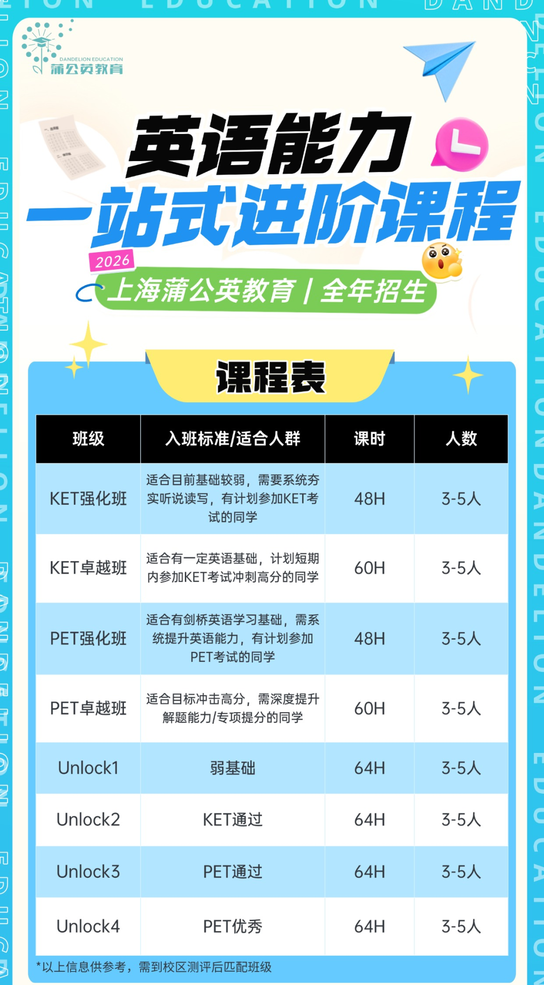 上海蒲公英教育2026英语能力一站式进阶课程,专为上海小升初、英语能力进阶的孩子量身打造,全方位解决备考痛点。针对不同基础的孩子,蒲公英教育设置了分层课程体系,课程采用小班教学,兼顾个性化与互动性,精准拆解考点,帮助孩子突破词汇积累、学术阅读、逻辑梳理等备考难点。上海蒲公英教育全年招生,扫码即可预约专业测评,解锁专属备考规划!如果你正在准备KET备考,或者不确定孩子的备考学习路径是否正确,可以联系蒲公英老师 +v:P15502147668 预约一次免费的KET水平测试和试听课,上海蒲公英教育专业老师帮你找到*适合的KET备考方案。