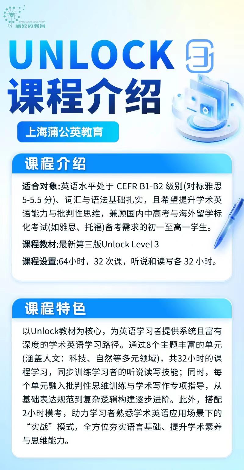 以Unlock教材为核心,为英语学习者提供系统且富有深度的学术英语学习路径。通过8个主题丰富的单元(涵盖人文:科技、自然等多元领域),共32小时的课程学习,同步训练学习者的听说读写技能;同时,每个单元融入批判性思维训练与学术写作专项指导,从基础表达规范到复杂逻辑构建逐步进阶。此外,搭配2小时模考,助力学习者熟悉学术英语应用场景下的"实战"模式,全方位夯实语言基础、提升学术素养与思维能力。